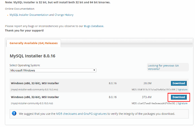画面下部までスクロールし、「Download」ボタンをクリックします。MySQLのインストーラには、Web経由でダウンロードしながらインストールするインストーラ(上)とインターネットに接続しないでインストールできるインストーラ(下)があります。ここでは、 インターネットに接続しないでインストールするため、下の「Download」をクリックします。なお、MySQL Installerは、32ビット版しかありません。64ビット版のMySQLインストールでも、インストーラは32ビット版となります。