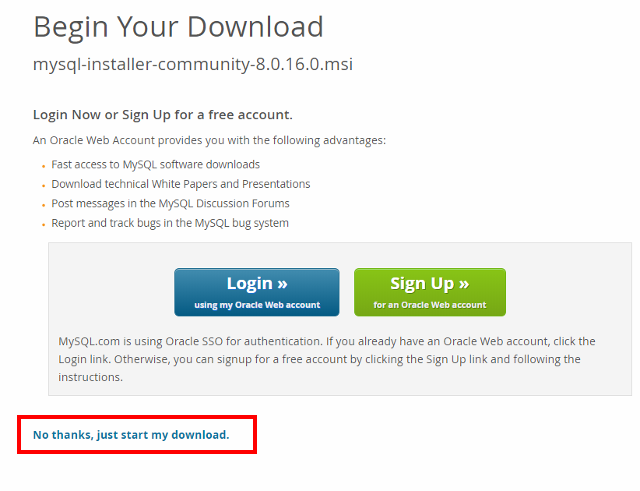 「Oracle Web account」のログイン画面が表示されます。アカウントを持っていなくてもインストーラをダウンロードできます。その場合は、下部の「No thanks, just start my download.」をクリックします。