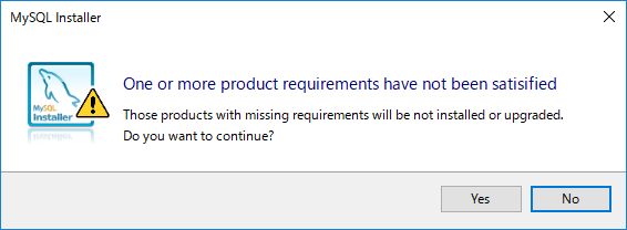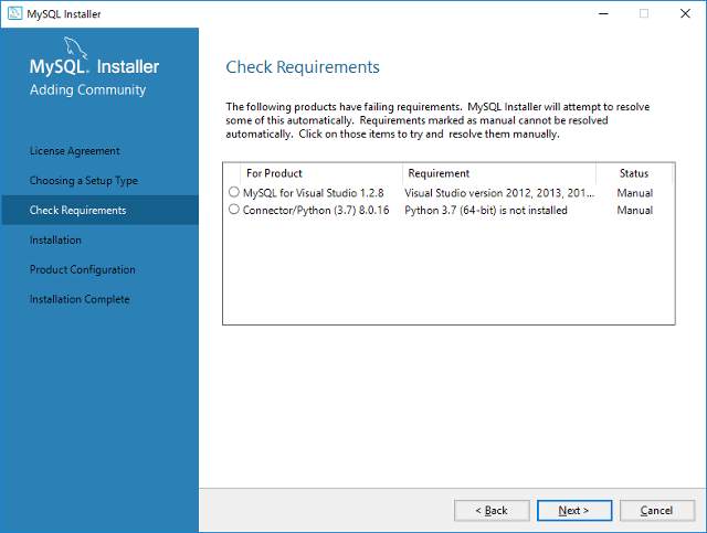MySQLの追加機能の実行に必要なライブラリがインストールされているか自動的に確認されます。「Check Requirements」画面には、要件を満たしておらずインストールできない製品が表示されます。対象があってもここではそのまま「Next」をクリックします。