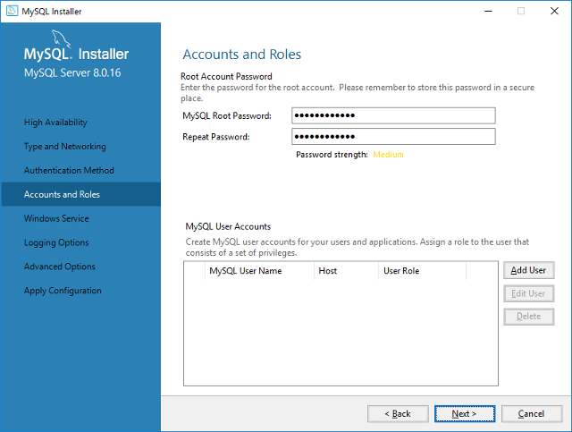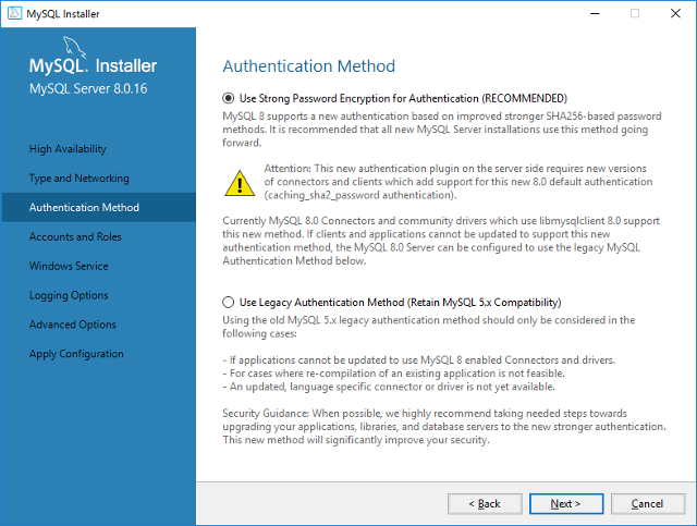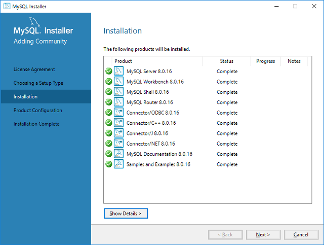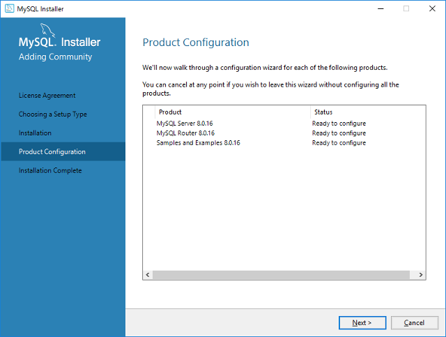 「Product Configuration」画面が表示されます。「Next」をクリックするとまず「MySQL Server 8.0.16」の設定画面に遷移します。