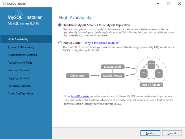 「High Availability」画面が表示されます。ここでは「Standalone MySQL Server/Classic MySQL Replication」を選択し、「Next」をクリックします。