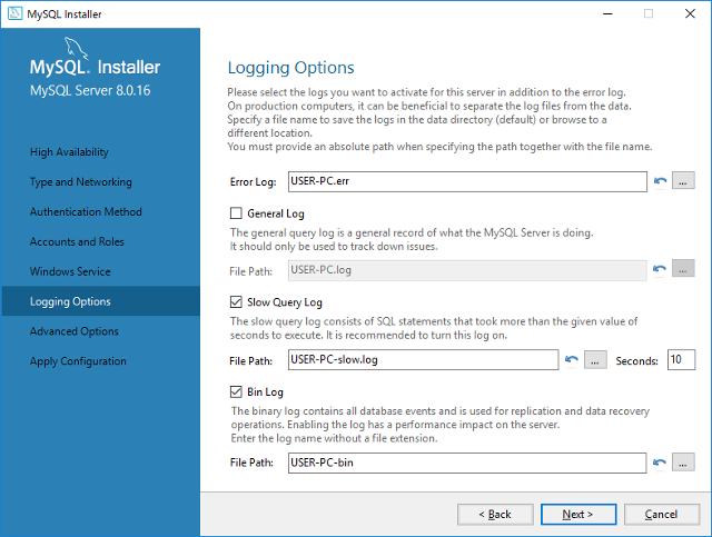 「Logging Options」画面が表示されます。ここではMySQLのログの設定を行います。どこにどのような出力されるか確認します。今回は設定の変更は特にせず、「Next」をクリックします。