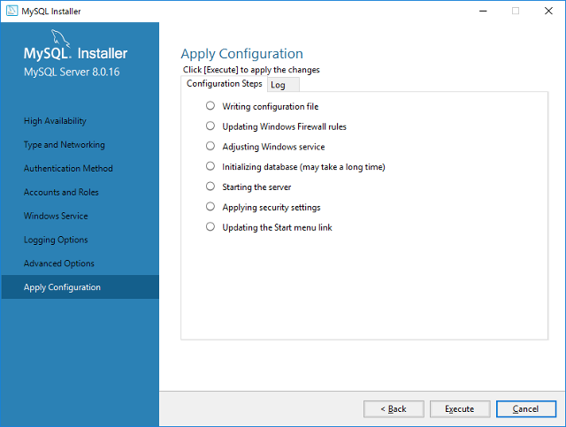 「Apply Configuration」画面が表示されます。「Execute」をクリックし、MySQL Serverへサンプルの設定を適用します。
