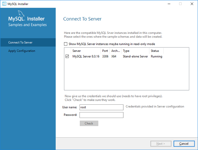 MySQL Serverへの接続について設定します。デフォルトでユーザ名とパスワードが入力されている状態なので、先ほど設定したrootのパスワードを「Password」欄に入力し、「Check」をクリックします。