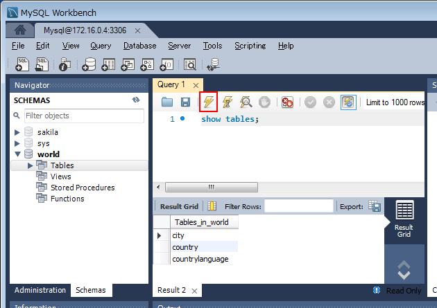 左ペインの「Schemas」タブを選択し、「world」-「Tables」をクリックします。