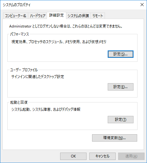 システムのプロパティを開き、「環境変数」ボタンを押下します。