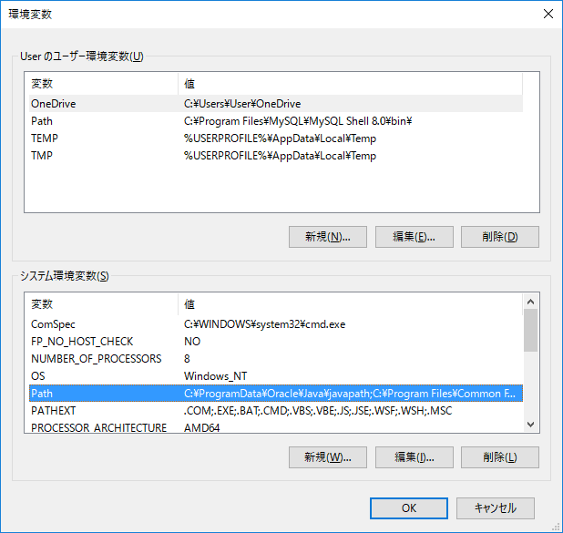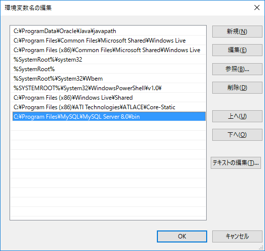 コマンドプロンプトからmysqlコマンドを実行するために、あらかじめ実行パスを設定しておきます。